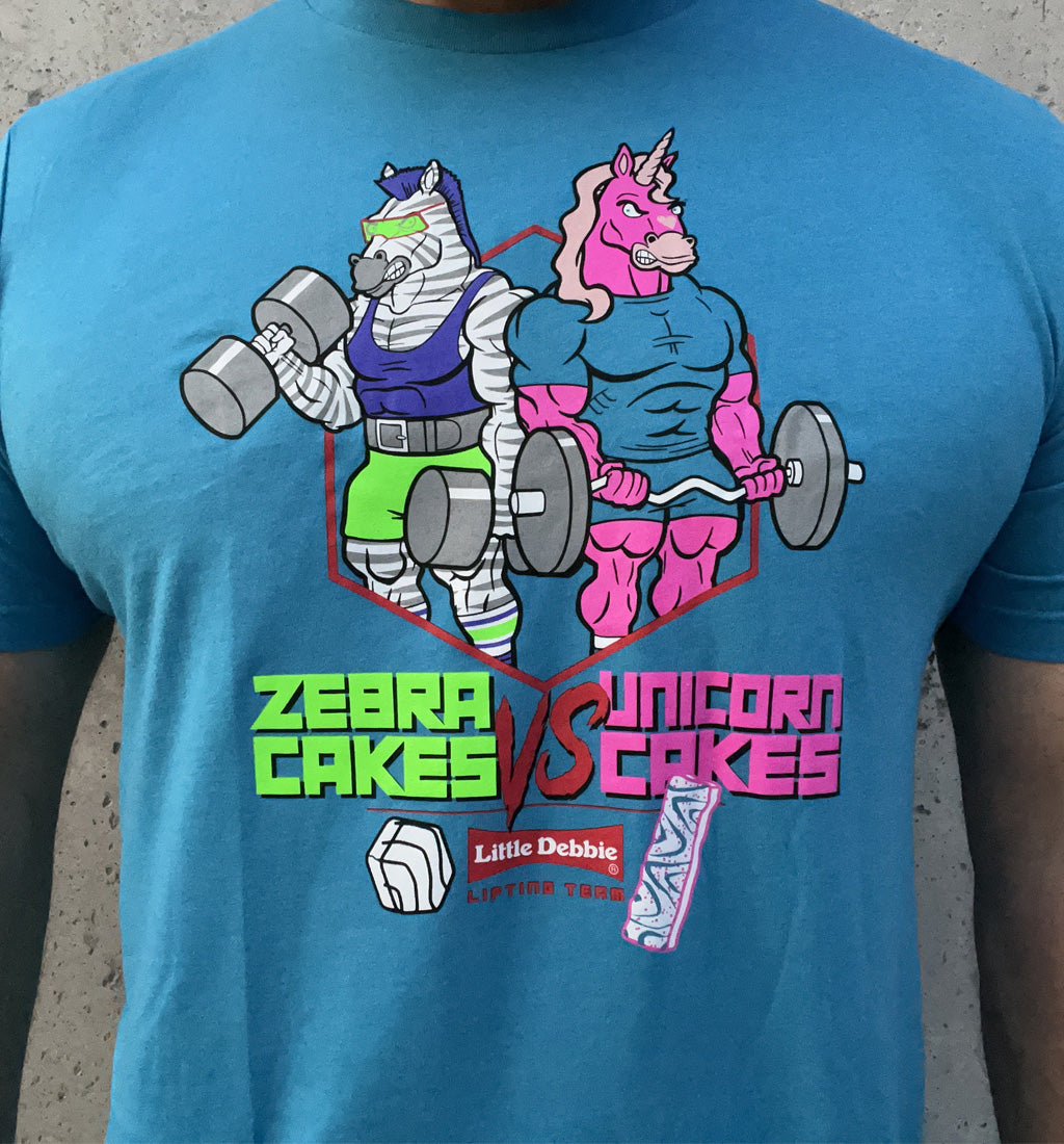 So, what'll it be? Zebra Cakes, or Unicorn Cakes!? Little did we know, Unicorns are more than just a pretty face! And, Zebra shows he's more than just a model of great squats, he hits arm day! Whoever you choose, just know this original design is best served with a heavy dose of arms ... and snack cakes!