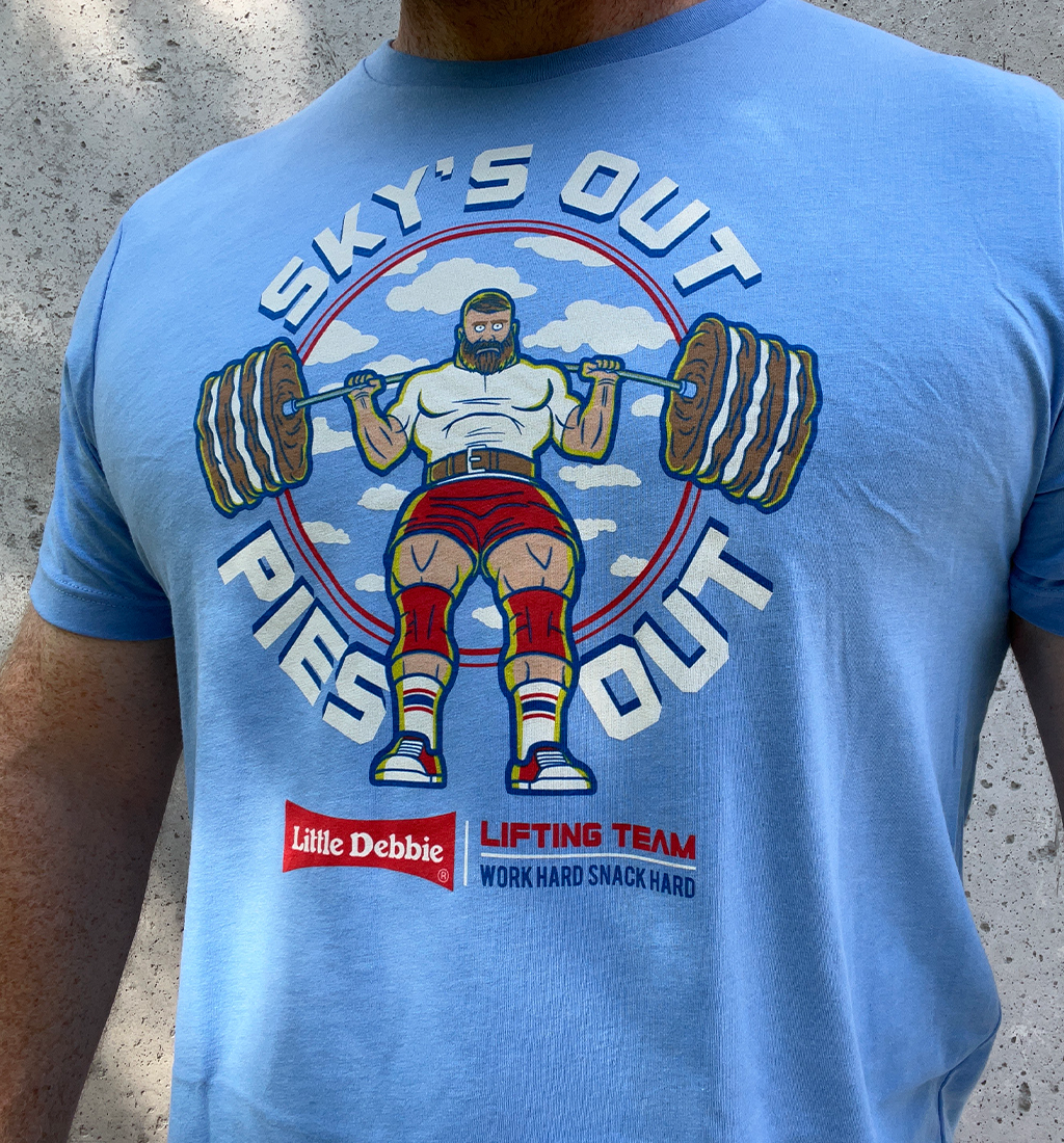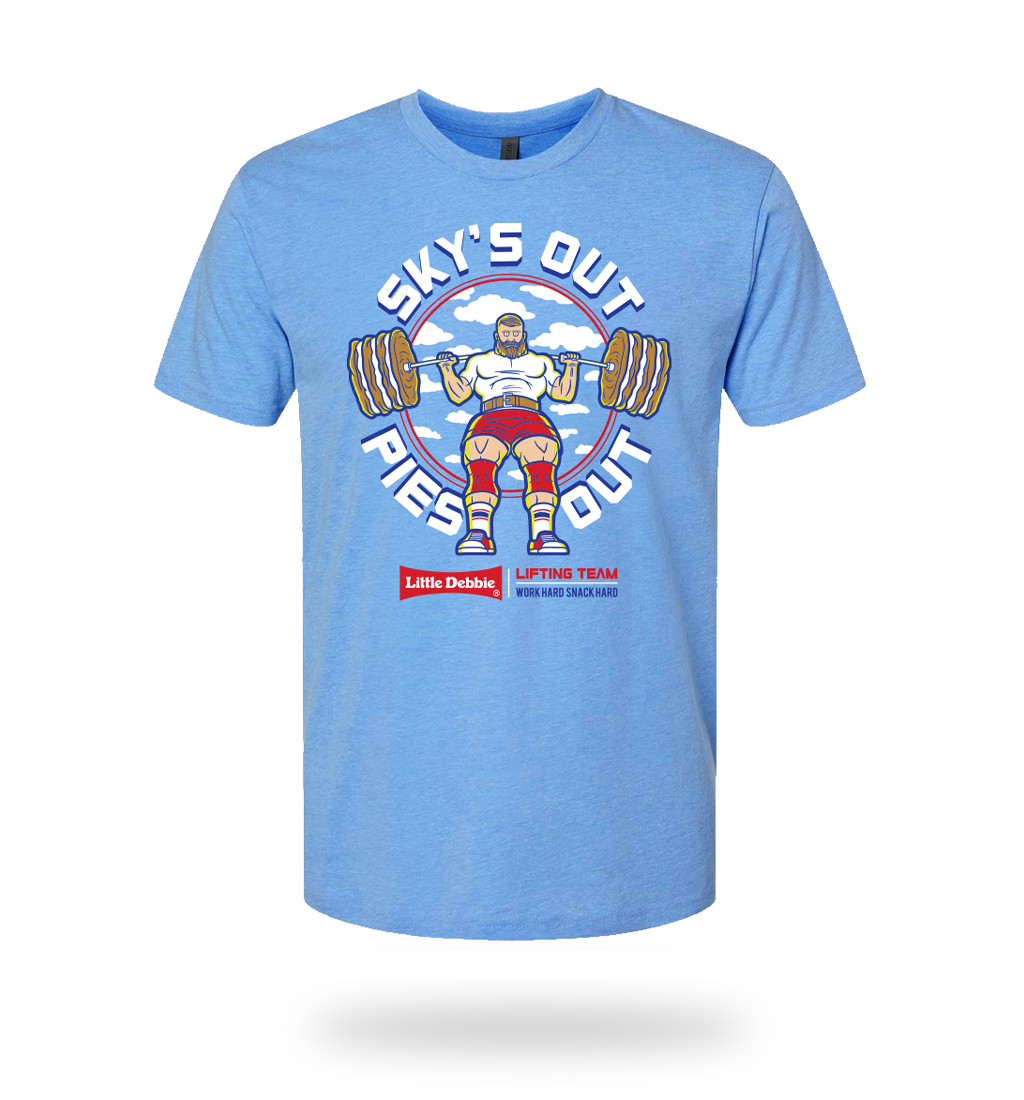 As a lifter, there comes a time when you have to buckle down and get after it - this is usually after the pre-workout kicks in, when you're running short on time, when your buddy slaps your back with authority, or when the Sky is Out. Yep. When the sun comes out, the guns come out, and when the sky comes out, the pies come out! Let this shirt remind you of when to get after it ... but in the weight room and with some Oatmeal Creme Pies!