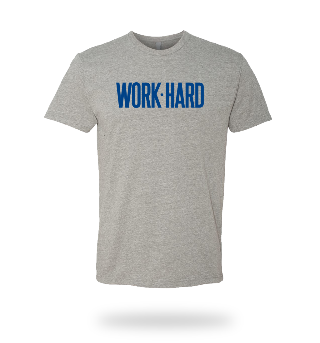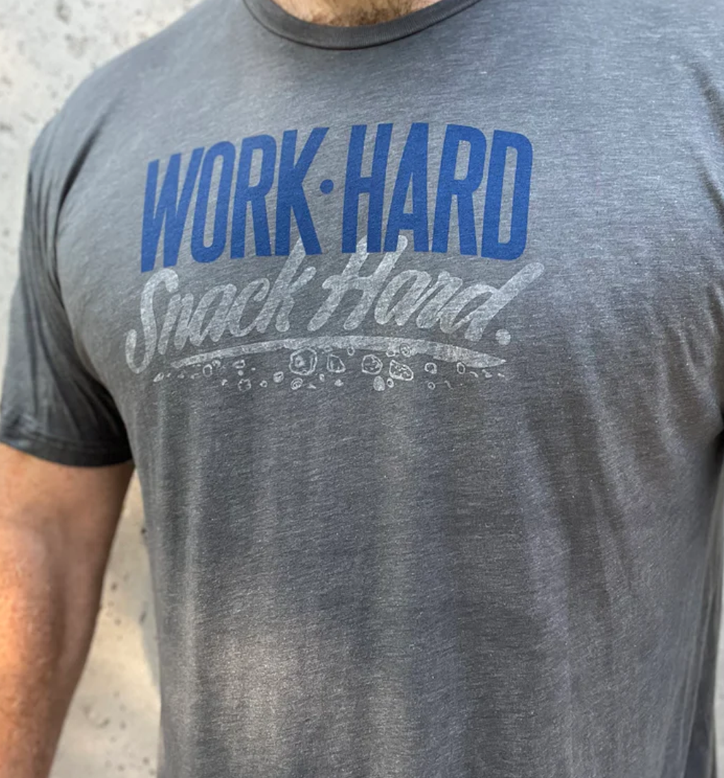 - Double sided WORK HARD / SNACK HARD tag on the bottom of the shirt to remind you to do both.