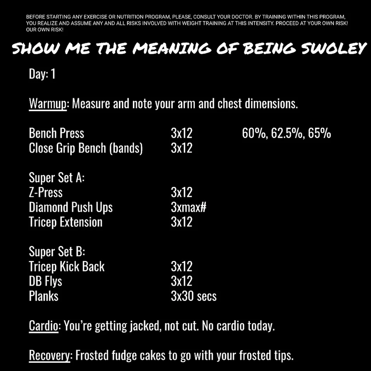The greatest hits from the JackedStreet Boys! Days like, "Show Me the Meaning of Being Swolely," "Call of Duty: Jacked Ops" make this five-day a week training plan (four upper, one lower) a sure-fire way to get jacked. Get ready for high reps, high soreness, high impact and high jackedness!