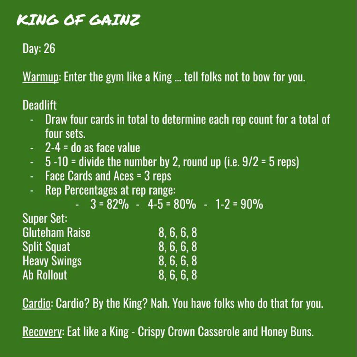 Wanna play a game? Or, should I say, "GAINZ!?" This is a month long workout dedicated to achieving gains through a ladder system for all the lifts! (i.e. 8, 6, 4, 8 type of rep schemes). In addition to the ladders, two of your four days (days change each week) include a dice roll or card draw to establish your rep scheme! May Lady Luck (Little Debbie) be on your side!